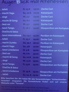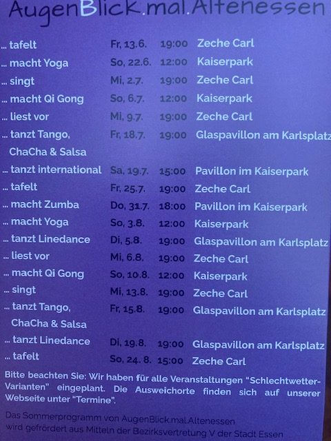 Mit der Abschlussveranstaltung auf der Zeche Carl ist nun auch das Sommerprogramm „AUGENBLICK MAL ALTENESSEN“ zu Ende. Seit nunmehr 3 Jahren finden diese Sommeraktivitäten im Raum Altenessen statt. Etwa 20 Veranstaltungen vom Tafeln, Singen, Vorlesen, Line-Dance, Yoga…….usw. wurden auch in diesem Jahr von Ehrenamtlichen gestaltet. Die Beteiligung und Resonanz ist dabei aufsteigend und sehr gut. Beim Line-Dance waren z.B. 80 Personen dabei. Ich denke, dass kann sich sehen lassen.